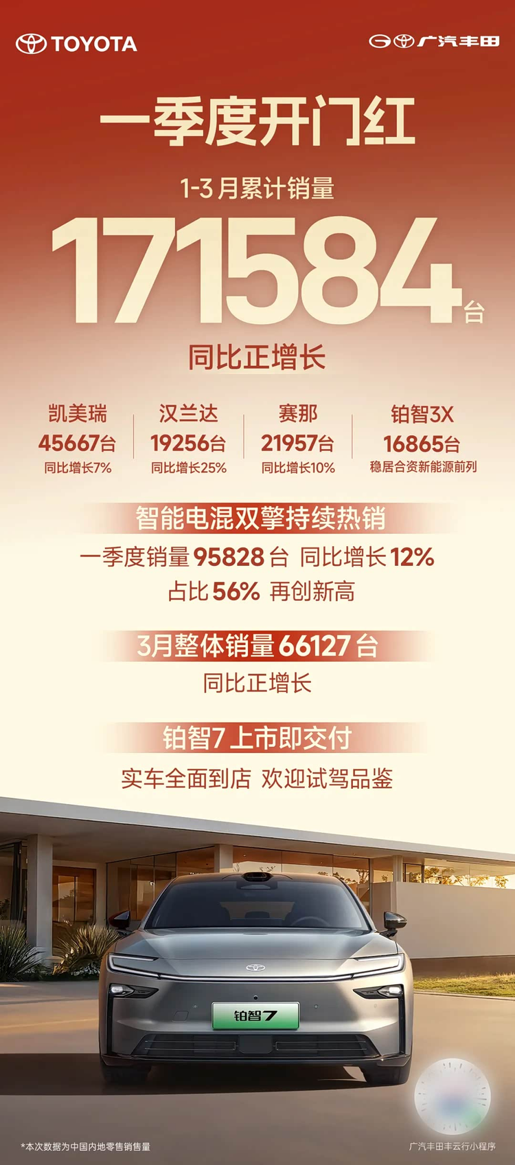 4月1日,广汽丰田公布最新销量数据,2026年1-3月,广汽丰田累计销量171584辆,实现同比正增长。具体来看,凯美瑞销量45667辆,同比增长7%;汉兰达销量19256辆,同比增长25%;赛那销量21957辆,同比增长10%;铂智3X销量16865辆。据悉,即将于4月交付的旗舰轿车铂智7,预售订单已突破8000辆。
