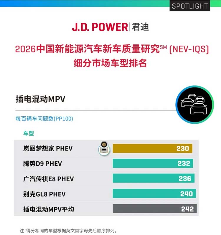 日前,在J.D.Power发布的2026中国新能源汽车新车质量研究(NEV-IQS)中,岚图梦想家荣膺插电混动MPV质量第一,成为该榜单唯一获奖的MPV车型。J.D. Power被誉为汽车界“奥斯卡”,其研究基于行业通用的IQS体系,并针对新能源车特有问题进行补充,统计新车主2-6个月拥车期内的质量问题,以平均每百辆车问题数(PP100)为评价标准,数值越低代表质量越好。岚图梦想家能在这一严苛评价中拔得头筹,含金量十足。