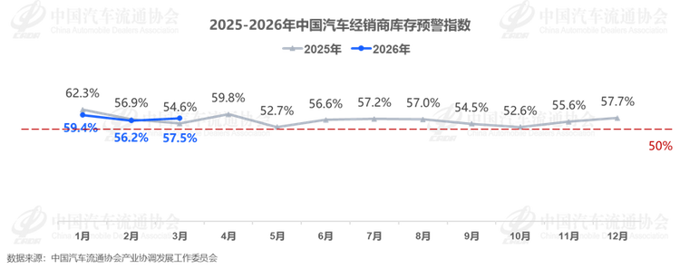 中国汽车流通协会发布的最新一期“中国汽车经销商库存预警指数调查”显示,2026年3月中国汽车经销商库存预警指数为57.5%,同比上升2.9个百分点,环比上升1.3个百分点,库存预警指数位于荣枯线之上。调查显示,35.7%的门店存在中度库存压力,23.6%压力较大,14.3%面临严重积压,仅12.1%的门店库存处于合理可控区间。