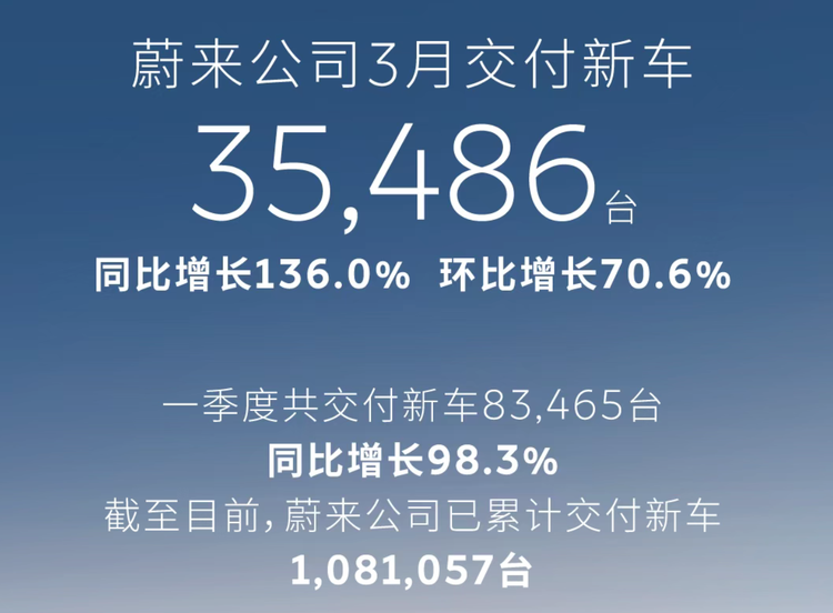 蔚来 3 月交付 35486 台,同比暴涨 136%,环比增长 70.6%,创品牌单月交付历史新高,一季度累计交付 83465 辆,同比增长 98.3%。主品牌全新 ES8、 ES6(参数|询价) 持续热销,牢牢守住 30 万以上豪华市场基本盘;此前表现黯淡的乐道、萤火虫品牌迎来全面反弹,3 月分别交付 6877 台、6119 台,环比均实现翻倍增长,多品牌战略终见成效。4 月蔚来将迎来新品密集投放期,旗舰 SUV ES9、2026 款乐道 L90 将陆续发布,持续完善产品矩阵。
