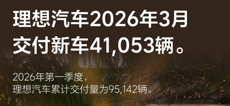 3 月理想彻底迎来强势反弹,当月交付 41053 辆,同比增长 11.94%,环比增长 55.38%,一季度累计交付 95142 辆,彻底扭转开年同比下滑颓势。此次回暖核心来自纯电产品全面突破,理想 i6 单月交付突破 24000 辆,占品牌总交付量 58.5%,成为全新销量支柱;i8 产能爬坡稳步推进,标志着理想纯电布局正式进入收获期。此前电池供应问题已全面解决,全新 L9 改款将于二季度上市,在销量走高的同时保持稳定单车毛利,为全年盈利目标提供支撑。