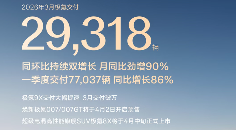 极氪延续豪华新能源增速标杆表现,3 月交付 29318 辆,同比增长 90%,一季度累计交付 77037 辆,同比增长 86%。极氪 9X 单月交付破万,成为增长核心引擎,45 万元级极氪 8X 将于 4 月中旬上市,持续扩容产品矩阵,巩固高端市场地位。