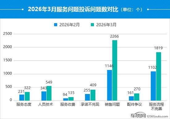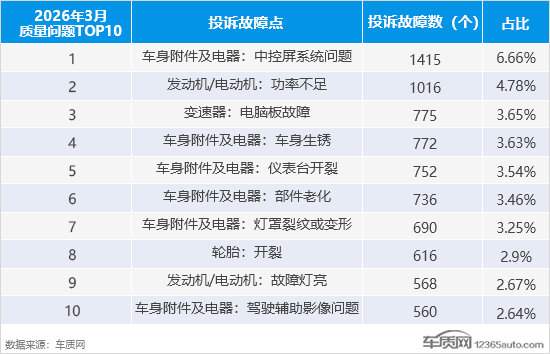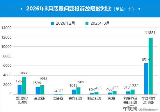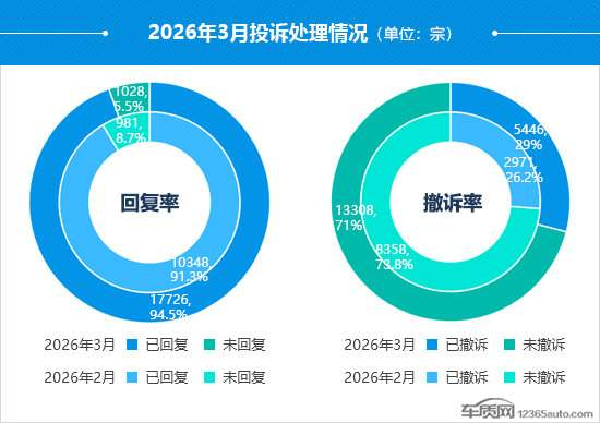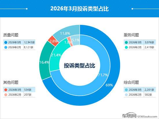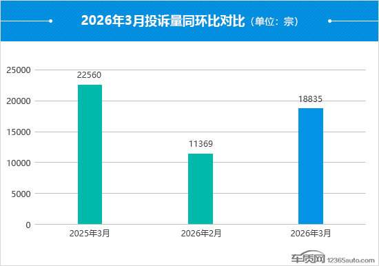 据国内领先的缺陷汽车产品信息收集和汽车消费者投诉信息受理平台车质网统计,2026年3月共受理车主有效投诉信息18,835宗(其中含第三方平台和后装轮胎投诉共81宗),环比上涨65.7%,同比下降16.5%。
