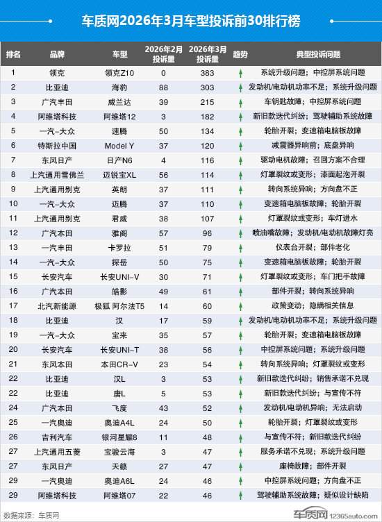 数据显示,本月车质网受理的有效投诉信息共涉及999款车型,其中投诉达两位数(含)以上的车型共301款。此外,车质网本月共接到车企针对投诉的回复19,071条(含部分之前月份投诉的回复)。在去除投诉人因为车企解决得当而自愿申请撤诉的信息后,2026年3月投诉量前30的车系(车型)排名如下: