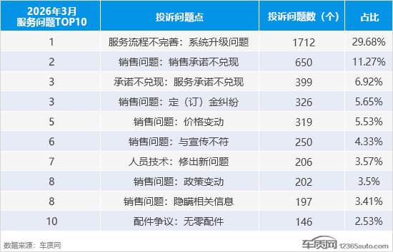 3月,销售问题和服务流程不完善依旧是投诉最为集中的两大问题点,投诉问题数环比都出现了大幅增长。从TOP10榜单中可以看到,“销售承诺不兑现”投诉问题数环比涨幅较大,在总量中的占比已升至两位数。
