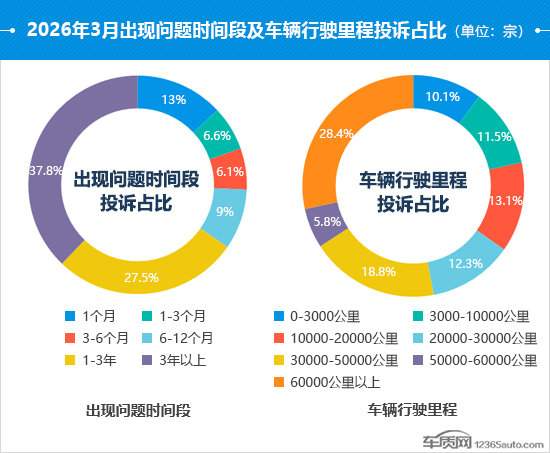 从车辆行驶里程投诉占比情况来看,行驶里程在20000公里以内的投诉占比出现反弹,环比提升2.4个百分点。行驶里程在60000公里以上的投诉占比开始出现回落,较2月降低1.9个百分点。