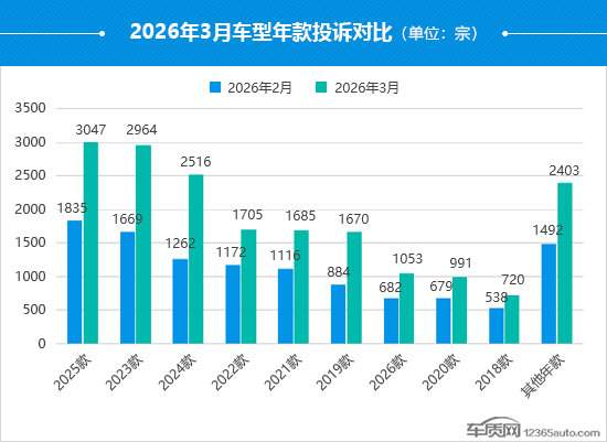 3月,各车型年款投诉量出现普涨,其中2023款、2024款及2025款车型涨幅尤为明显。值得注意的是,2026款车型投诉量再次突破千宗,环比上涨54.4%,投诉增量主要来自于东风日产N6。