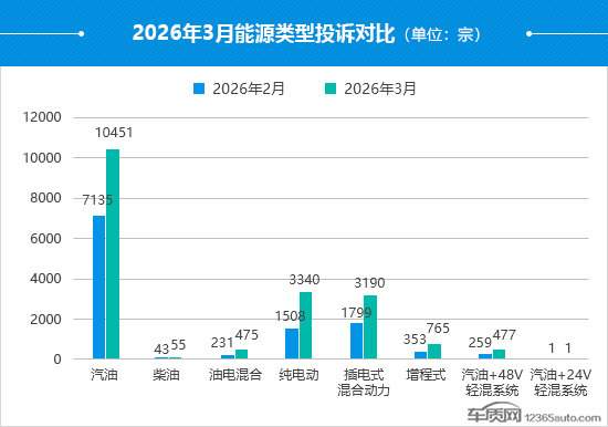 3月,汽油车型投诉量再度突破万宗,环比上涨46.5%,但占比较2月有所下降。相比之下,新能源车型(纯电动、插电式混合动力和增程式)投诉量增幅显著高于汽油车型,环比大涨99.3%,且占比提高了6.6个百分点,已接近总量的4成。