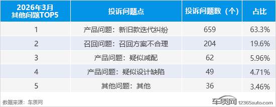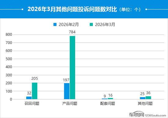 在本月其他问题投诉问题点中,产品问题投诉问题数迎来暴涨,环比涨幅近3倍。从问题点排名来看,“新旧款迭代纠纷”、“召回方案不合理”成为两大投诉焦点,投诉问题数环比涨幅均呈现翻倍态势。