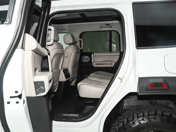 车身侧面部分,新车型在车顶增加了行李平台,轮眉使用了新的造型,全新的20英寸锻造越野轮圈使用了花瓣风格造型,搭配全地形轮胎,还使用了氮气减震。