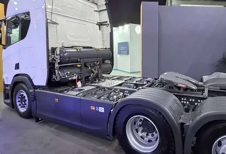 斯堪尼亚此次采用了一种在中国市场已应用多年的解决方案:将气罐不仅布置在车架两侧,还叠放在驾驶室后方。这使得总储气容量增加了一半以上,单次加注续航里程达到约600公里,对于压缩天然气牵引车而言相当可观。需要强调的是,这里使用的是压缩CNG/bio-CNG气罐,而非液化LNG/bio-LNG。这一点很重要,因为英国的生物沼气厂主要供应压缩气体,这也是市场上的主流产品。