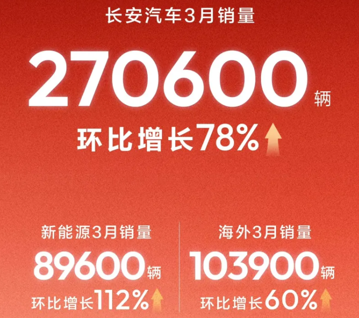 长安汽车3月销售新车27.06万辆,环比增长78%。其中,新能源汽车销量达89600辆,环比大幅增长112%,显示出强劲的增长动能。子品牌方面,长安启源3月销量36875辆(+102%),深蓝汽车销量31742辆(+88%),阿维塔销量5143辆。深蓝汽车作为长安新能源的主力军,3月表现尤为突出,为长安整体新能源销量贡献了重要力量。