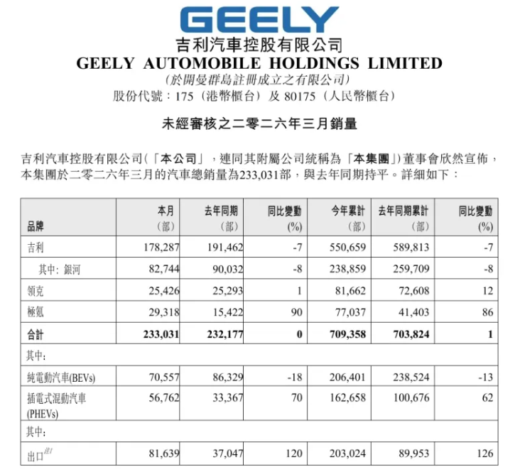吉利汽车3月总销量为23万辆,与去年同期基本持平。但在新能源细分领域,纯电动汽车销量为7.06万辆,同比减少18%。这一数据反映出吉利在纯电转型过程中面临一定压力。不过需要看到的是,吉利旗下极氪品牌表现强劲,3月交付29318辆,同比增长90%,成为吉利新能源板块的重要增长极。整体来看,吉利在新能源转型中呈现“子品牌突围、母品牌承压”的结构性特征。
