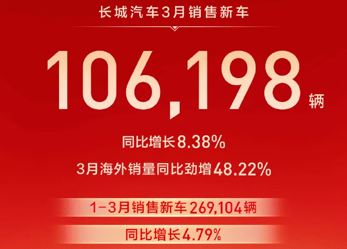 长城汽车3月销量为106,198辆,同比增长8.38%。其中,新能源车销售21857台,新能源渗透率约20.6%。分品牌看,哈弗品牌销量57021辆(+8.13%),WEY品牌销量7751辆(+65.80%),坦克品牌销量18316辆(+5.38%),欧拉品牌销量2529辆(-8.90%)。值得一提的是,3月长城海外销售47142台,全球化战略持续推进。整体而言,长城汽车保持了稳健的增长态势,但新能源领域的表现仍有提升空间。