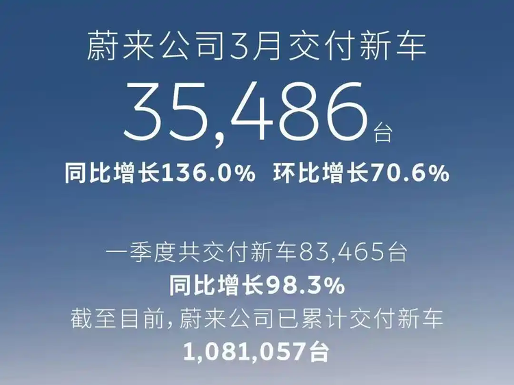 蔚来公司3月交付新车35486辆,同比大幅增长136%,环比增长70.6%。其中,蔚来品牌交付22490辆(+120.1%),乐道品牌交付6877辆(+42.7%),firefly萤火虫品牌交付6,119辆(+130.3%)。多品牌战略在3月初显成效,乐道和萤火虫品牌均实现快速增长。一季度蔚来累计交付83465辆,同比增长98.3%,也超出外界预期。