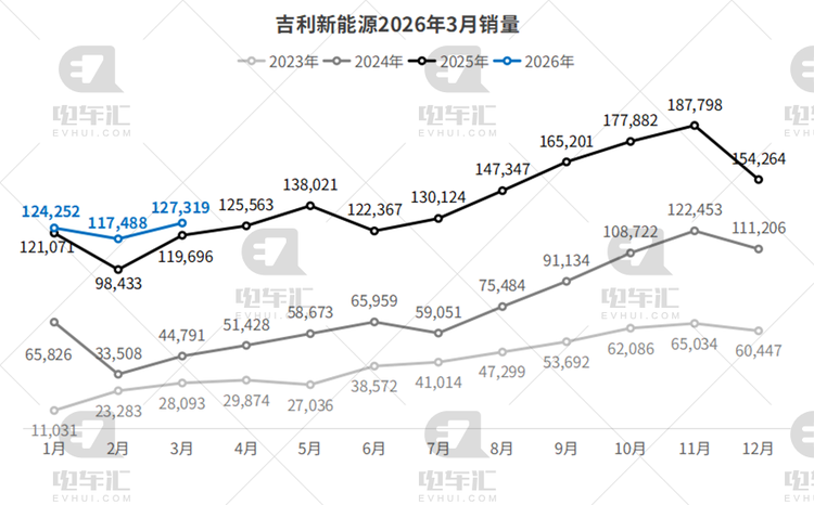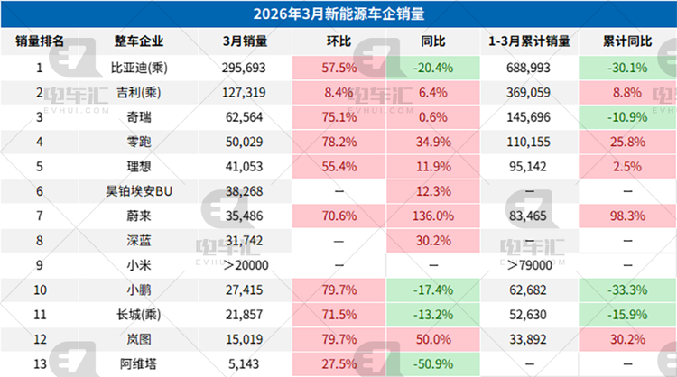吉利新能源以127,319辆位列第二,环比增长8.4%,同比增长6.4%,新能源占比55%;1-3月累计369,059辆,同比增长8.8%,新能源占比52%。旗下银河品牌3月销量达82744辆,1-3月累计238859辆;极氪29318辆,同比增长90%,1-3月累计77037辆,同比增长86%;领克新能源家族13056辆,同比增长148%,新能源占比51%,1-3月累计50962辆,同比增长34%,新能源占比62%。