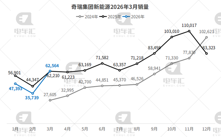 奇瑞新能源3月销量62,564辆,环比增长75.1%,同比微增0.6%;1-3月累计145,696辆,同比下降10.9%。与此同时,海外市场成为增长核心引擎,出口量占集团总销量比重超60%,累计海外用户达623万,占全球1,900万总用户的三分之一。欧洲、东南亚及拉美市场表现突出, 星途瑶光(参数|询价)等高端车型推动“品牌出海”向高附加值转型。