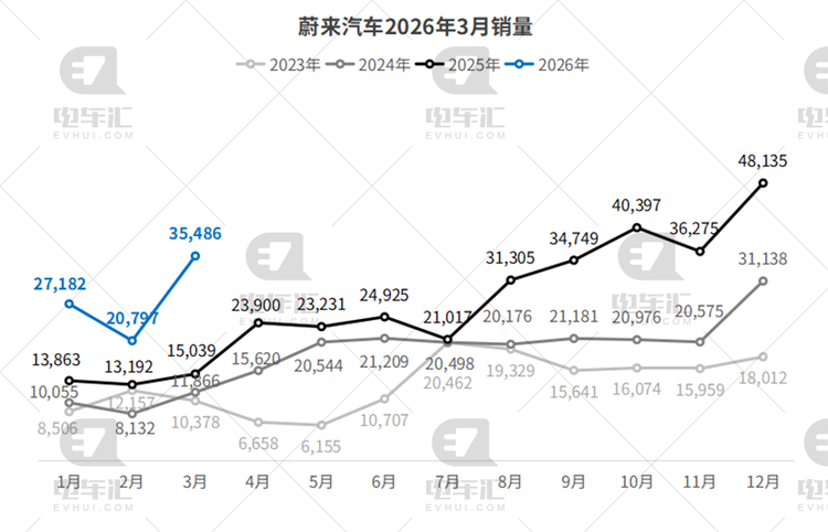 蔚来汽车3月交付35,486辆,环比增长70.6%,同比大增136.0%;1-3月累计83,465辆,同比增长98.3%。