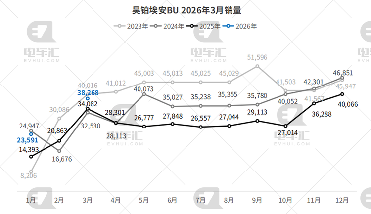 昊铂埃安BU3月销量38,268辆,同比增长12.3%;1-3月累计83,465辆,同比增长98.3%。其3月订单表现稳健,AION Y Plus和AION S Plus持续贡献主力销量。