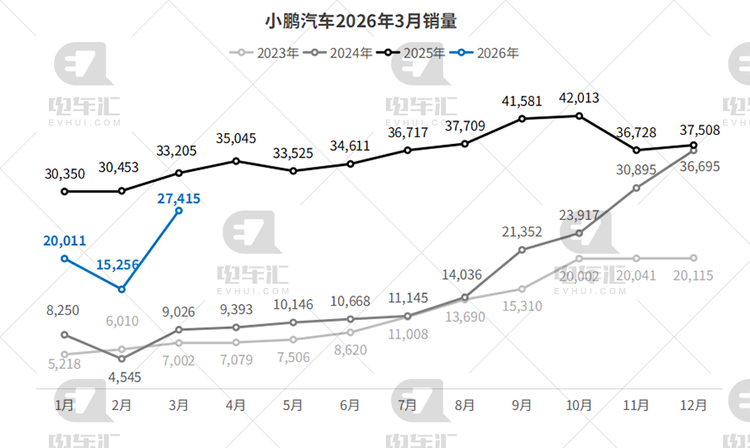 小鹏汽车3月销量27,415辆,环比增长79.7%,但同比下滑17.4%;1-3月累计62,682辆,同比下降33.3%。公司加速全球化布局,3月宣布进入新西兰市场,G6与P7+首批车辆已从连云港启运。3月25日,小鹏在墨西哥发布“领航拉美智行三年战略”,计划2027年同步引入纯电与增程双动力车型,并正式在当地上市G6(起售价约合人民币31万元)和G9(约合42万元)。