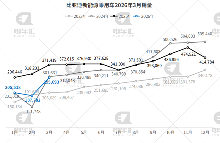 比亚迪乘用车3月以295,693辆位居第一,环比增长57.5%,同比下滑20.4%;1-3月累计销量688,993辆,同比下降30.1%。其中,插混乘用车型3月销量约148,092辆,纯电乘用车型约147,601辆。海外方面,比亚迪乘用车及皮卡3月出口超10万辆,延续高增长态势。