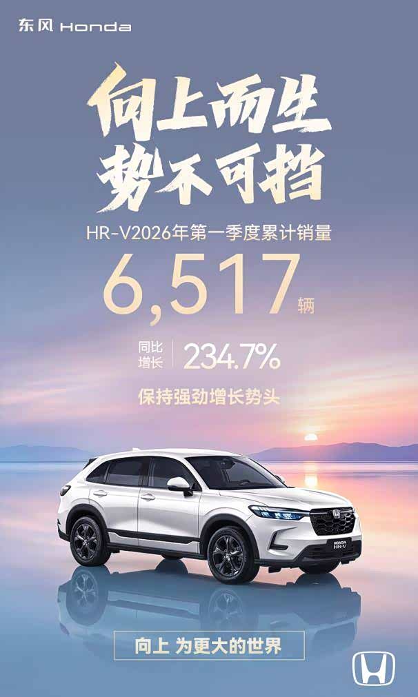 如果说CR-V是品牌的“压舱石”,那么与之同宗同源的HR-V则是增长的“新引擎”。 一季度,HR-V售出6,517台,同比增长234.7%,凭借强劲的增长势头成为品牌的新锐力量。HR-V承袭本田全球造车基准,与CR-V共享同款动力总成与底盘技术,以"高质平价"的产品定位打破十万级SUV市场"够用就好"的价值标准,成为都市新锐群体的进阶之选。