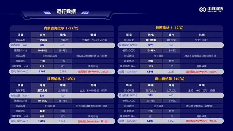 测试结果远超预期。实测数据显示,海星钠离子电池单公里能耗较锂离子电池低12%-16%。李树军解释,这个数字在极低温下看似低,实际上是因为“极寒工况下,车的传动系统阻力、轮胎阻力太大导致的,不是电池的问题”,绝对节省量并未减少。