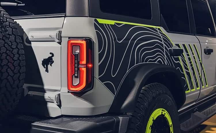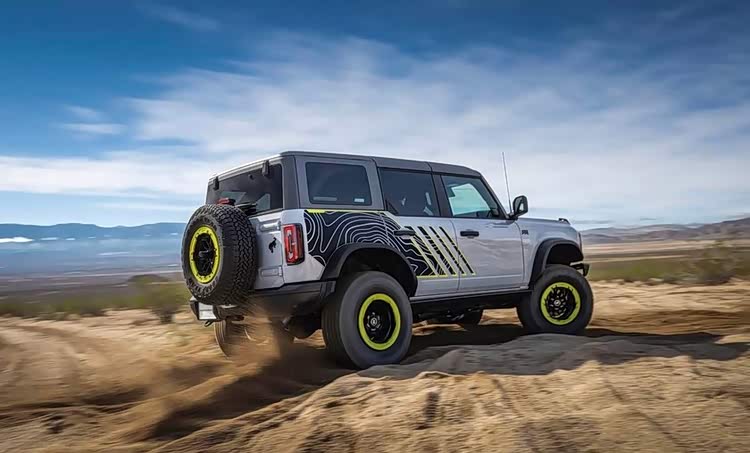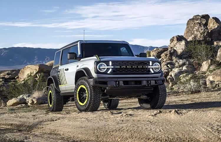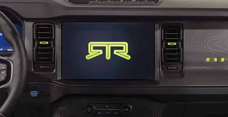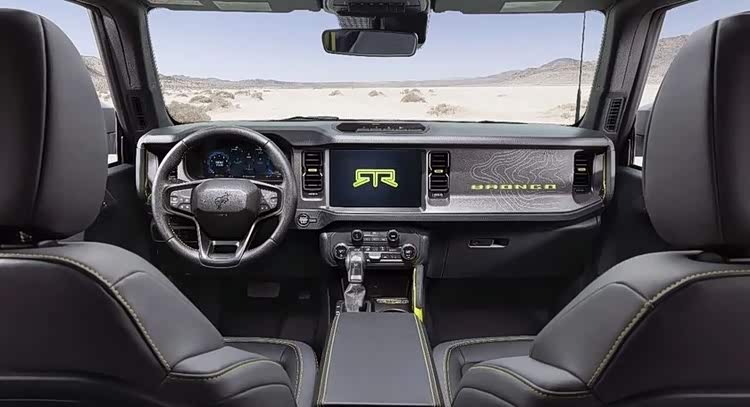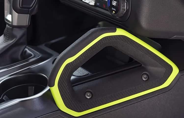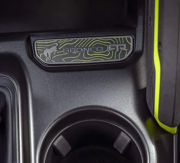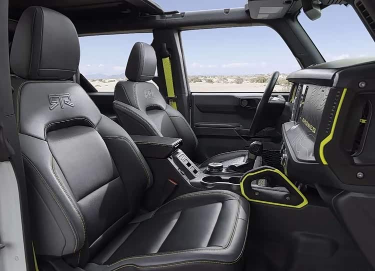 外观方面,烈马Bronco RTR整车采用灰色车漆作为主色调,搭配超亮青柠色元素进行点缀,视觉冲击力十足。新车对前格栅、灯组造型以及前翼子板等部位进行了优化升级,进一步提升了整车的辨识度。同时,烈马Bronco RTR还将标配防脱圈轮圈,并提供RTR专属车身拉花供消费者选择;福特官方也明确表示,车主可根据个人喜好,选择不含青柠色装饰及车身拉花的简约外观版本。除此之外,33英寸轮胎与升高悬架均为该车标准配置,同时还提供可选装的“大脚”套件,升级后将配备35英寸轮胎、进阶版Fox减震器以及前后桥差速锁,进一步强化越野性能。