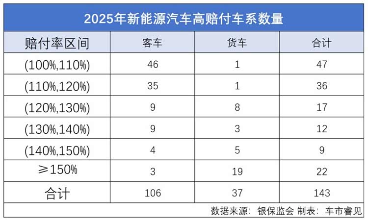 从出险率来看,新能源汽车的电动化、智能化特性使其风险特征与传统燃油车显著不同。数据显示,新能源汽车整体出险率高出燃油车约20%,其中智能驾驶辅助系统的误判、电池热失控风险与车身轻量化设计导致的碰撞损失扩大,都是重要诱因。更值得关注的是,高赔付车系数量持续增加,2025年赔付率超100%的车系达143个,同比增加6个,其中货车高赔付(≥150%)问题尤为突出,37个货车高赔付车系成为行业赔付压力的核心来源。