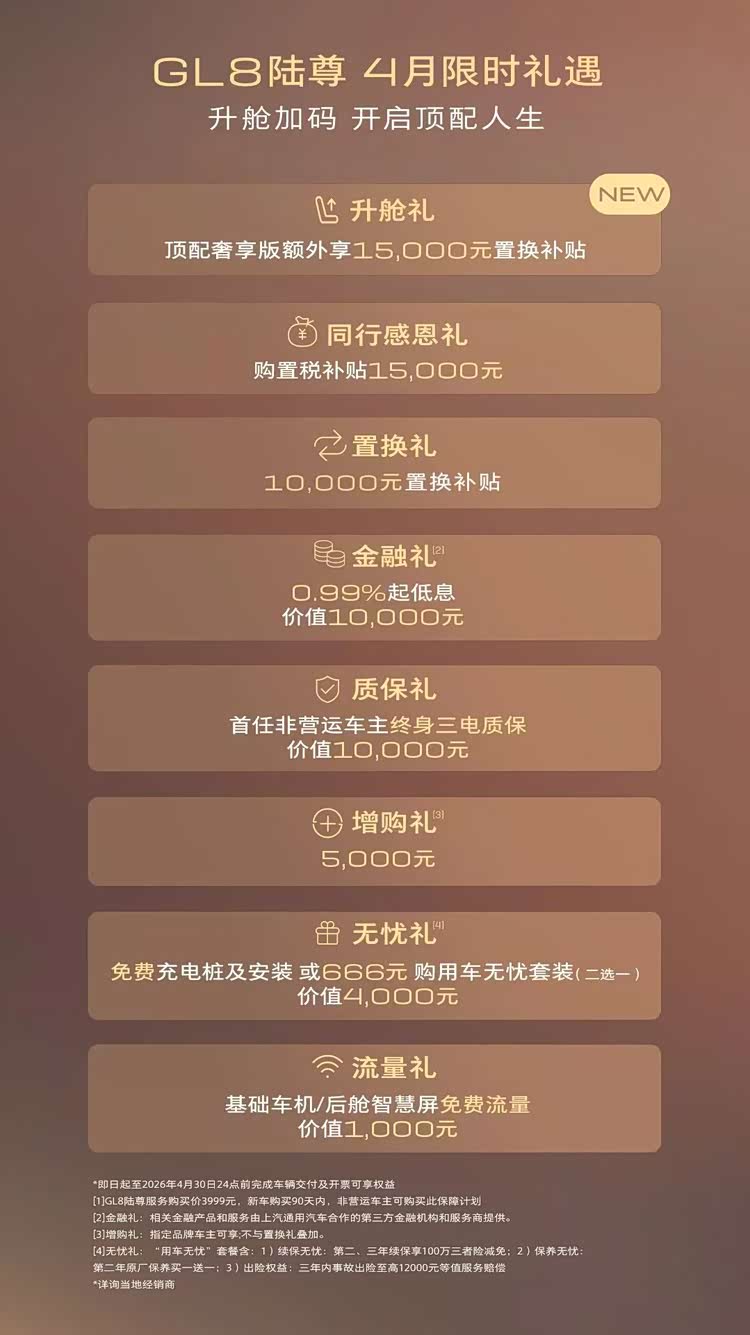 日前,上汽通用别克品牌公布了别克GL8陆尊车型4月份的购车优惠政策。与3月份不同的是,别克GL8陆尊奢享版权益加码,限时享2.5万元置换补贴(增加1.5万元)。同时,购车用户还可选择“金石之约”权益(购买价:3999元),3年内单次车损大于等于购车价30%,别克官方将免费换新车。