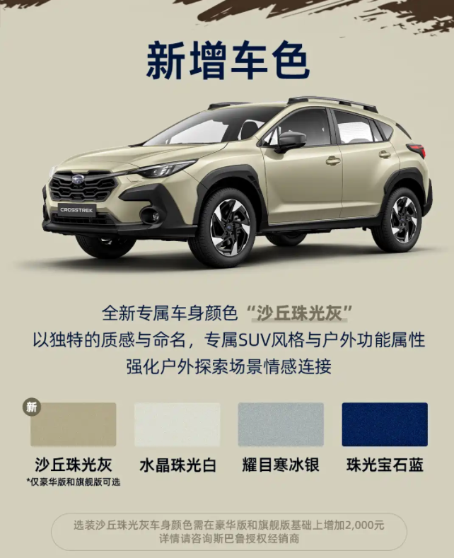 车家号·0浏览·2026-04-02 15:00 · 北京4月2日,新款斯巴鲁CROSSTREK 旭豹(参数|询价)正式上市,3款车型的售价在19.98-23.08万之间。新车提供5年或75000km内15次免费基础保养,提供STI加装项目,项目包括轮圈中心盖、气门嘴、水箱盖等,加装后的颜值有很大提升。
