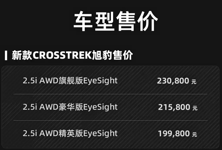 答答点评:CROSSTREK旭豹是斯巴鲁家族入门级的紧凑型SUV,初代车型命名为斯巴鲁XV,定位比傲虎低一级。与同级别的森林人相比,CROSSTREK旭豹的车身尺寸更小,价格也更低,车内空间不及森林人,家用表现不及同级别的CR-V、RAV4,车机、智能方面比不上国产的新势力,2025年全年的销量仅一千多台。新款CROSSTREK旭豹全系11气囊,EyeSight进行了升级,新增的驾驶员异常监测可在驾驶员疲劳、分神时自动减速停车,新增的沙丘珠光灰车漆需额外支付2000元的选装费,性价比依旧不够出色,注定还是小众车型。