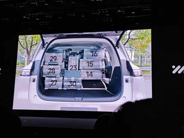 后备箱空间展示,好像是整车放进去了47个行李箱,当然,这个空间实验好像把能放的地方全部放进去了,就是主驾也进不去了……