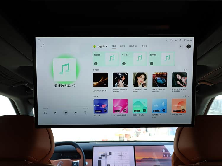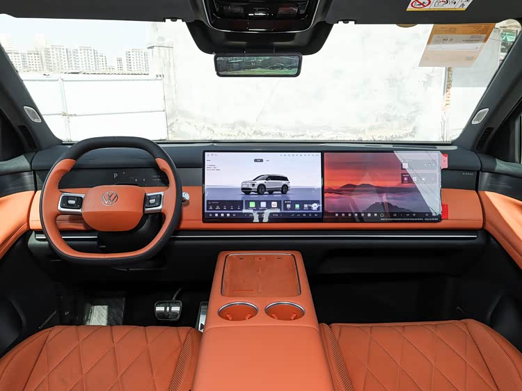 内饰采用一体环抱式座舱设计,流畅的线条从驾驶席前方延伸至两侧车门,看上去大气宽阔,并提供墨宝、本色、锦橙3款内饰风格。新车采用怀档设计,配备双辐式多功能方向盘,并提供8.88英寸智能仪表魔术屏、15.6英寸中控屏+15.6英寸副驾屏、W-HUD、流媒体内后视镜、6英寸二排门板智控魔术屏以及21.4英寸后排吸顶屏等多块屏幕,车机系统支持多屏画面流转、智能语音交互、智能手势交互、无麦K歌等多种功能。