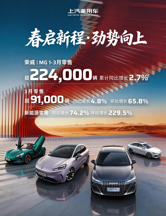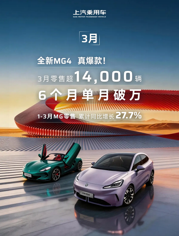 新能源领域成为本轮增长的重要来源。1-3月,上汽集团新能源车累计销售27万辆,占整体销量比重持续提升。其中,上汽乘用车新能源板块实现8.5万辆,同比增幅达到214.6%,显示出产品投放后的市场反馈较为直接。从车型维度看, MG4(参数|询价)在3月份销量超过1.4万辆,并连续6个月单月破万,说明其在紧凑型纯电市场具备一定用户基础。