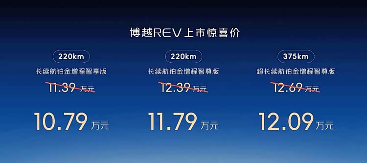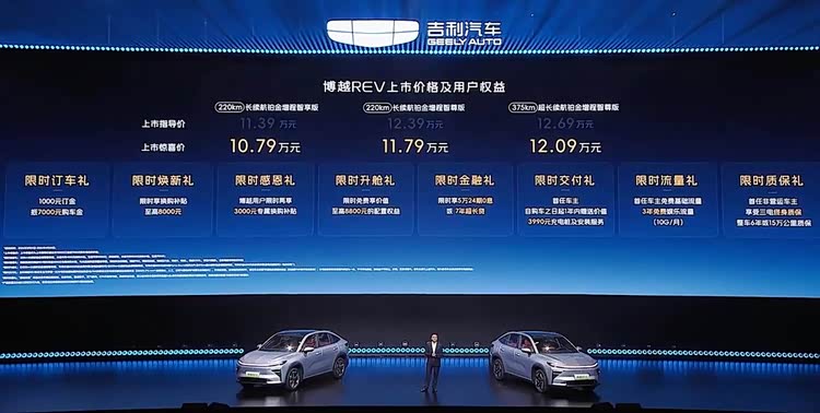 3月31日,吉利 博越REV(参数|询价)正式上市,新车共推出三款车型,售价11.39-12.69万元,上市惊喜价10.79-12.09万元。另外,新车还推出了诸多不错的权益,具体可以看下图。需要注意的是,新车定位为增程紧凑型SUV,最大的看点就在于纯电续航了,这个价格之下,它的CLTC纯电续航就有220km和375km,而且还支持3C快充,所以从这两个角度看,新车的性价比非常不错。
