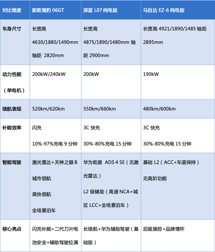 根据新款海豹06GT的价格和定位来看,它的竞争对手主要锁定深蓝L07、马自达EZ-6等车型。从上述表格能看出,新款海豹06GT属于“技术型选手”,核心优势是二代刀片电池+闪充技术,9分钟满电的体验是另外两款车所没有的,解决了纯电用户的“充电焦虑”,尤其适合经常跨城出行或充电不便的用户。但是车身尺寸在三车中不占优势,满载出游后排空间不如另外两车充裕。