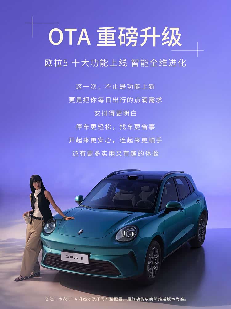 【中国·保定】2026年4月2日,“智能潮玩全球SUV”长城欧拉5(BEV车型)正式向用户推送首次OTA升级。本次OTA围绕都市青年高频用车场景,带来他们期待已久的10项重磅升级,覆盖智能辅助驾驶、主动安全、智慧安防、座舱交互及户外拓展等多个维度,其中包含车位到车位、记忆泊车、哨兵模式等核心功能,进一步提升用户出行的便利性、安全感与陪伴感。
