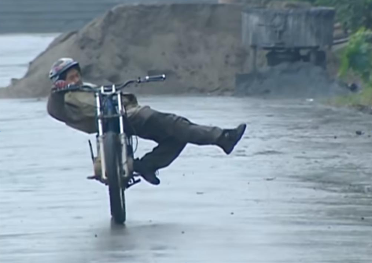 第一天,记者给了他20分钟,他在稻田里面骑着一辆破车表演。可是有可能车太旧,也有可能抓地力不行,也可能他技术不行,他反复出错,翘头翘不起来,冲不了上坡。记者后来摇摇头就要走,他觉得不够。当天晚上他就疯狂地发短信说:“我的梦,我的生活都是车。”