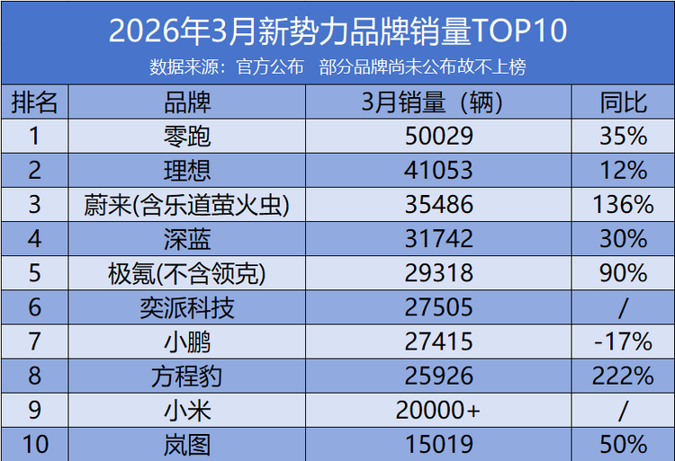 在车市回暖的大背景下,3月国内新势力品牌销量表现分化明显,既有逆势登顶的黑马,也有持续领跑的老将,更有初入榜单的新秀,完整呈现了当前新能源市场的竞争格局。