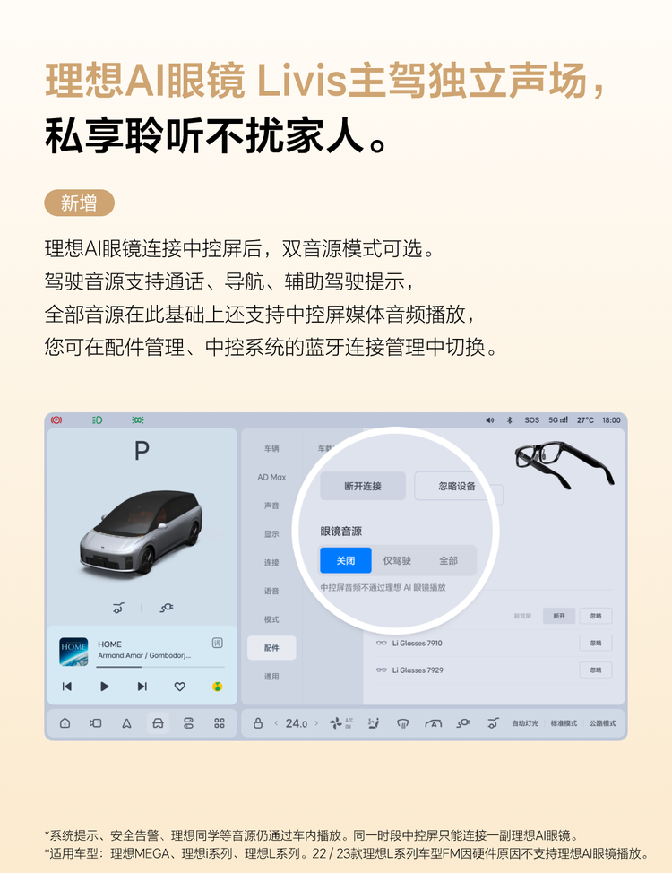 这次升级的一个亮点是理想AI眼镜Livis和智能座舱的生态融合。连接车机后,Livis新增了主驾耳机功能,提供两种模式切换。一种是“仅驾驶音源”,只把通话、导航、辅助驾驶提示这些驾驶相关的音频通过眼镜播放;另一种是“全部音源”,除了驾驶音源,还会覆盖中控屏的媒体音频。这样主驾就能有一个独立的声场,听音乐或者有声内容时不会打扰到车内的其他乘客。