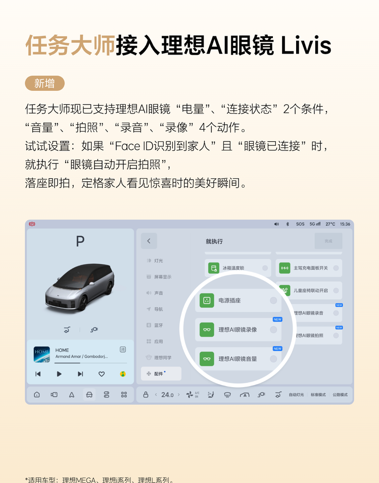 任务大师功能也正式接入了Livis眼镜。用户可以把眼镜的连接状态、剩余电量设为智能触发条件,然后搭配音量调节、拍照、录音、录像这些执行动作来自定义场景。比如,可以设置当眼镜电量低于20%时,让理想同学自动提醒充电;或者通过Face ID识别家人上车时,眼镜自动开始录像,记录下第一视角的出行瞬间。