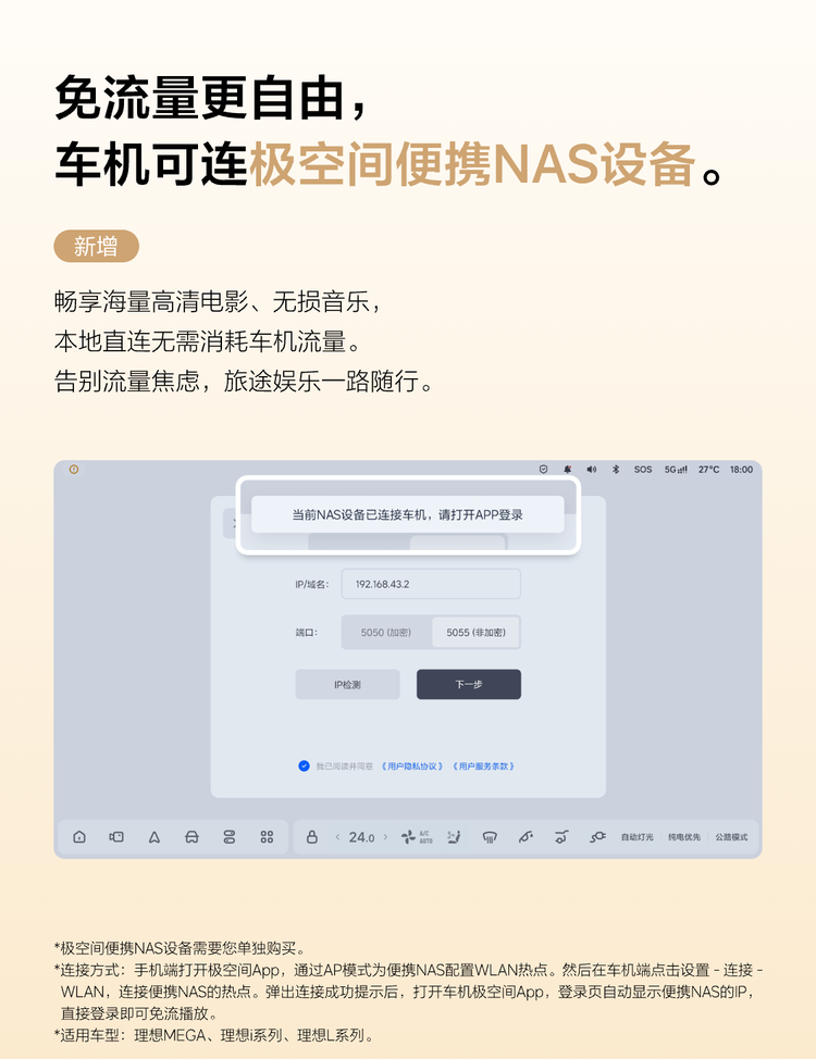 智能座舱这次新增了绿联云软件。用户可以在车内安全地访问家里NAS中存储的4K电影、无损音乐这些资源,相当于把家庭影音库搬到了车上。极空间便携NAS的体验也同步升级了,支持车机免流量连接播放,这样就不用担心影音播放消耗流量了。这个App近期会在应用商店上线。