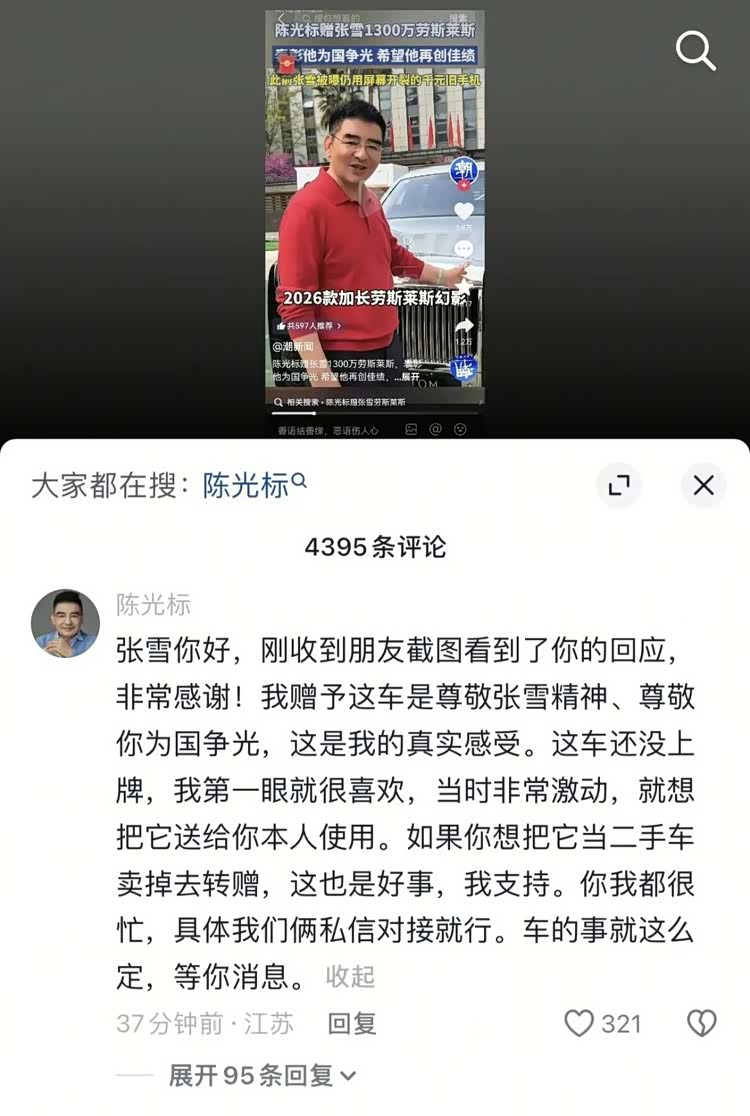 4月2日,慈善家陈光标就赠予机车企业家张雪劳斯莱斯一事再次作出回应。在张雪提出将车辆转售并捐赠所得款项后,陈光标表示,虽然赠车初衷是奖励其为国争光的精神并供其个人使用,但他同样尊重并支持张雪将其变现用于慈善的决定。目前,陈光标已喊话张雪,希望双方通过私信对接。