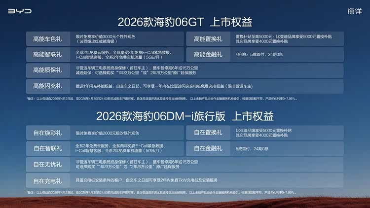 4月2日,比亚迪海洋网双车齐发——2026款海豹06GT与2026款海豹06DM-i旅行版同步上市。其中,2026款海豹06GT官方指导价为12.89-16.99万元,2026款海豹06DM-i旅行版官方指导价为11.19-13.99万元,两款新车还为用户提供涵盖购车、选装、养护等在内的多项权益,让用户真正实现无忧用车,2026款海豹06GT用户更可享受1年闪充补能权益,尽情领略全场景自由闪充的科技魅力。
