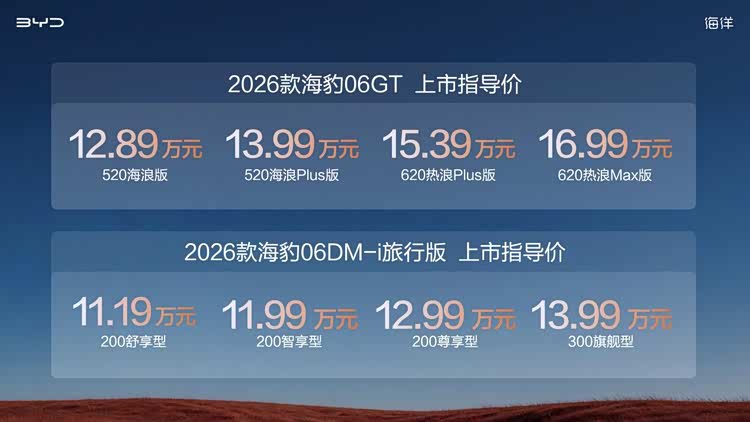 2026款海豹06GT与2026款海豹06DM-i旅行版此次焕新而来,不仅切实回应了用户真实需求,更直观彰显了比亚迪在新能源领域的技术领先性。目前两款新车已陆续到店,欢迎感兴趣的朋友走进比亚迪海洋网各大门店,亲自感受双豹齐发带来的个性出行新体验。