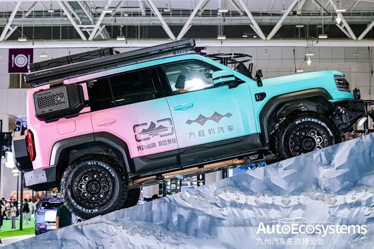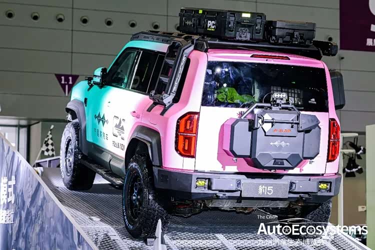 方程豹豹5粉青渐变越野改装版,是基于方程豹豹5硬派越野SUV打造的个性化定制车型,主打“颜值与性能双在线”的越野生活方式,精准击中女性越野玩家与潮玩爱好者需求。车型采用粉青渐变专属涂装,视觉辨识度拉满。核心改装围绕越野场景打造:车顶配备铝合金行李架与PC防水储物箱,集成侧爬梯,拓展装载能力;车尾升级定制备胎罩与外挂工具箱,预留拖车接口;换装全地形AT越野轮胎与防脱圈轮毂,搭配熏黑轮眉与竞技侧踏,强化非铺装路面通过性。