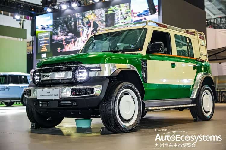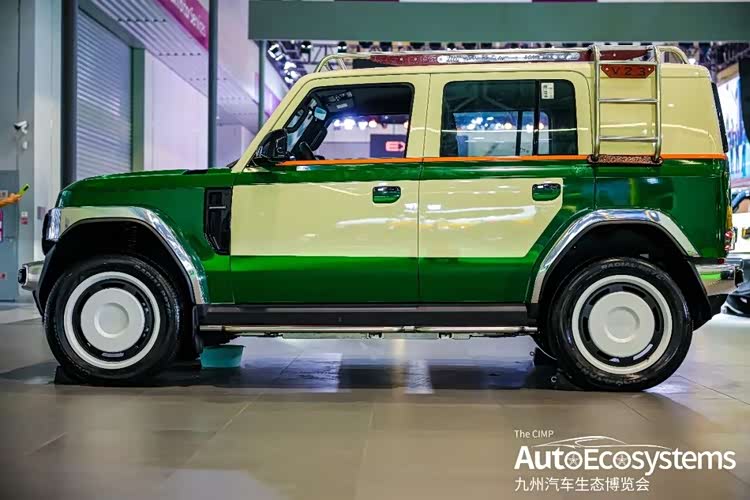 V23 CYBERSPACE复古版,是iCAR原厂打造的经典复古风格定制改装车型,基于iCAR V23纯电硬派SUV打造,主打90年代经典越野车美学。车型采用复古绿+奶白双色分层涂装,复刻经典方盒子造型,前脸配备亮面镀铬前杠与格栅,圆形大灯搭配复古白边轮毂,车顶加装不锈钢行李架与尾梯,细节处融入镀铬装饰,完美还原复古硬派质感。