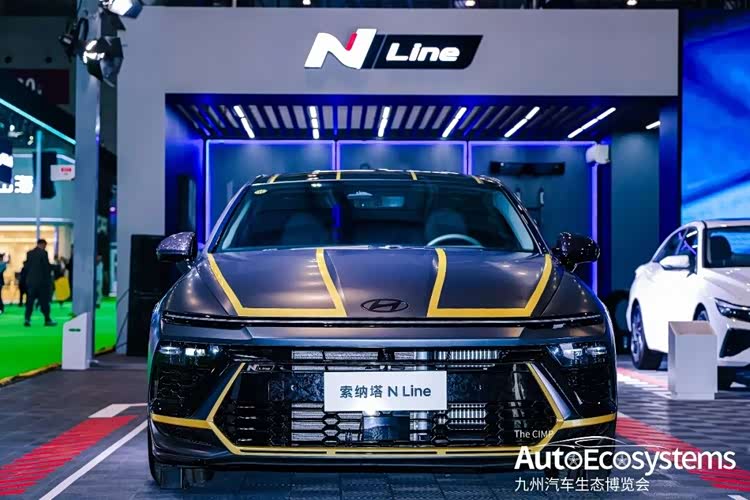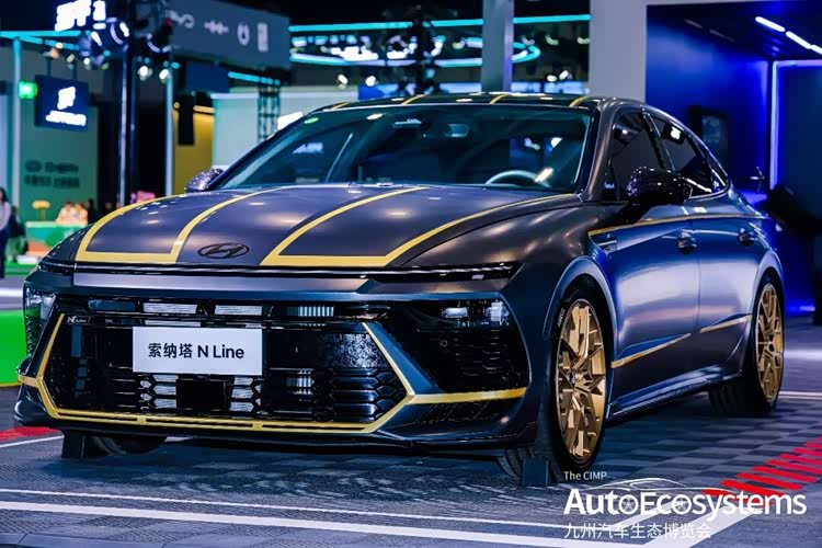 北京现代第十一代索纳塔N Line定制改装版,是北京现代基于索纳塔N Line原厂运动车型打造的性能向定制改装车,延续现代N品牌赛道基因,主打极致运动与视觉张力。车型采用哑光黑专属车漆,搭配贯穿式金色拉花,从引擎盖延伸至车身侧面,强化视觉冲击力。前脸配备N Line专属蜂窝状运动格栅、金色装饰包围与熏黑灯组,换装19英寸金色多辐式锻造轮毂,搭配碳纤维后视镜、运动侧裙与低趴姿态,完美复刻赛道化改装风格。