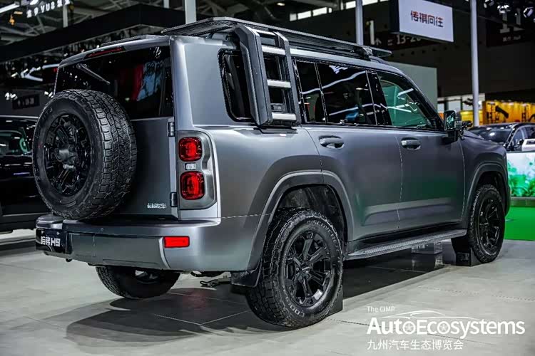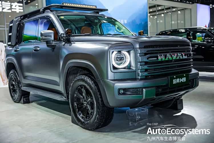 哈弗H9,以哑光灰越野改装版亮相,尽显硬派越野本色。新车采用经典方盒子造型,复古圆形LED大灯搭配熏黑横条格栅,HAVAL字母标识辨识度拉满;车顶加装LED射灯与行李架,侧挂爬梯与AT越野轮胎,强化户外属性。